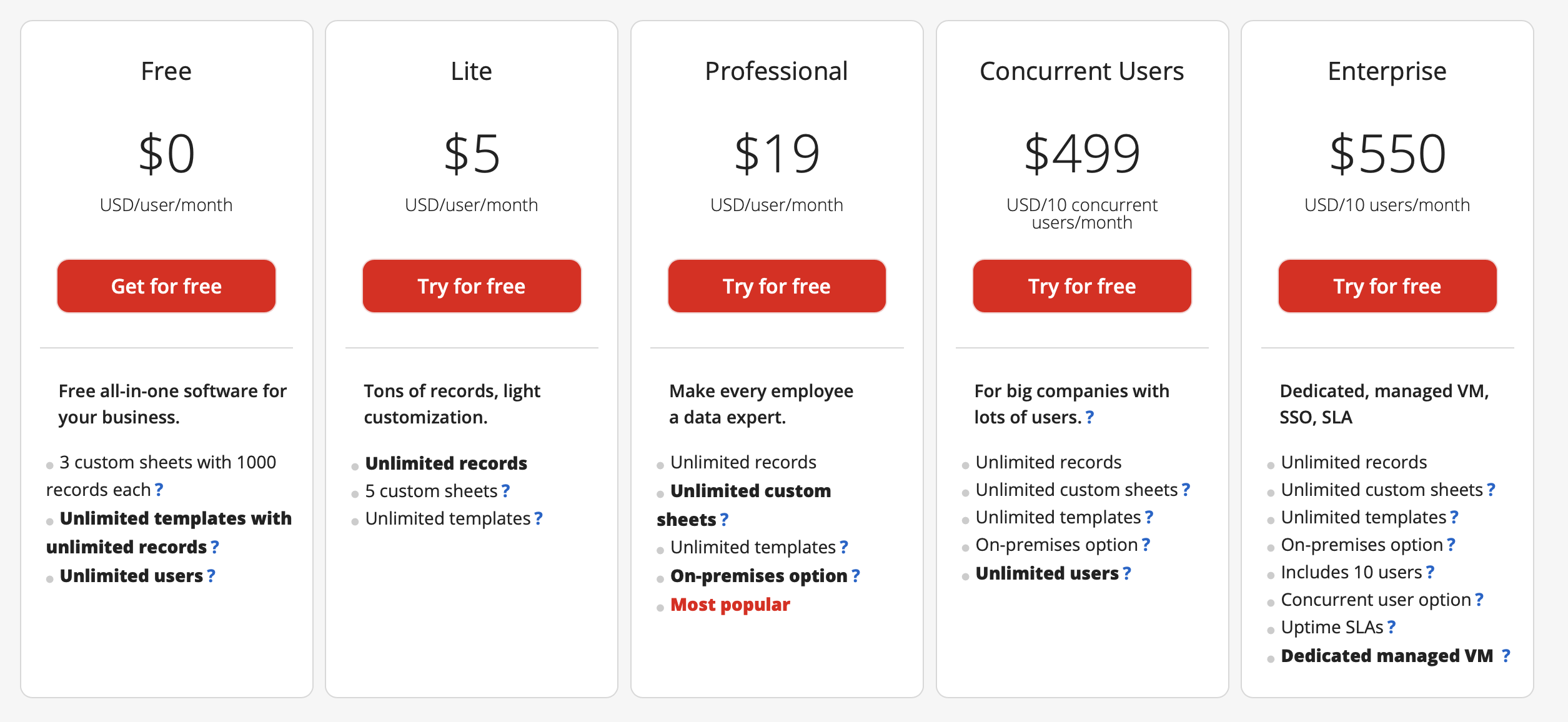 Similar to SmartSheet, Ragic also offers various pricing options and subscription tiers. However, Ragic’s pricing plans are more modular, offering greater flexibility for companies to start small and upgrade as they grow. Ragic’s subscription tier are as follows: