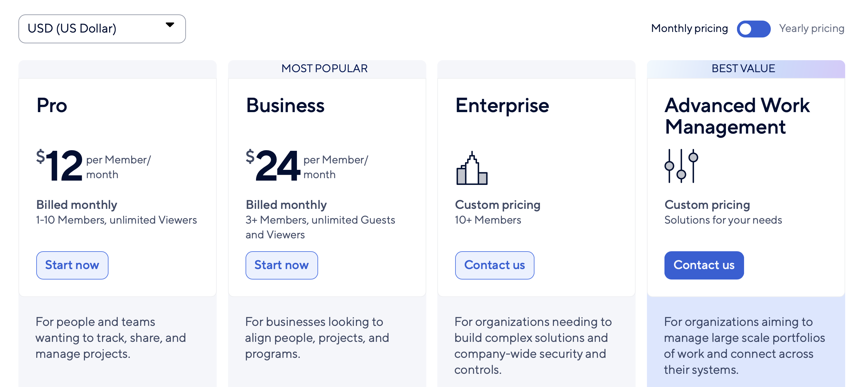 Both plans above do not include AI tools (despite SmartSheet’s heavy marketing on their AI capabilities) and have limitations to their level of customizability. In addition to these 2 tiers, SmartSheet also offers Enterprise and Advance Work Management plans that require custom pricing. These two tiers include AI tools, other customization features, better access controls, and customer support.